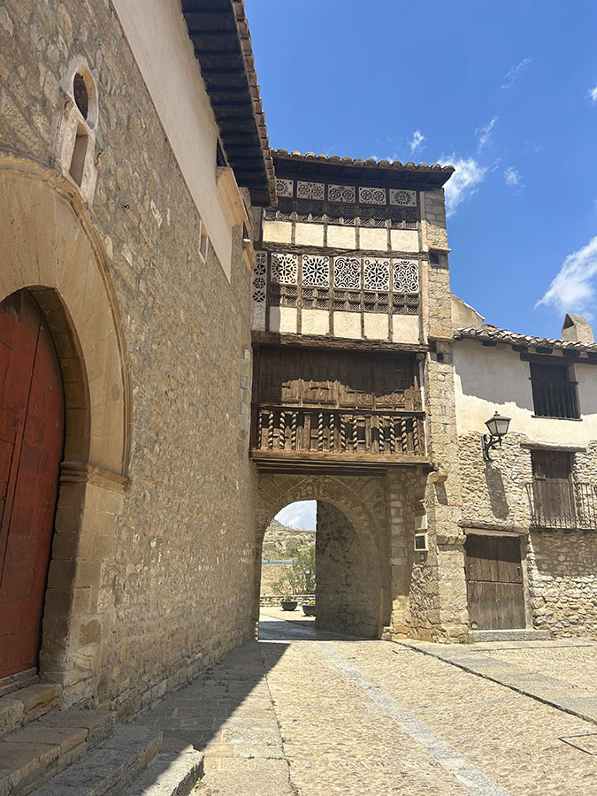 Para mí, el casco urbano en su conjunto es una maravilla. Está lleno de torreones, iglesias, conventos, casas señoriales o populares, palacios renacentistas, el castillo… Es imposible dejar de mirar o fotografiar cada rincón de Mirambel. El Portal de Las Monjas, una de las antiguas puertas de la muralla que se encuentra adosada al convento de las Agustinas, me dejó sin habla. Presenta un arco de medio punto hacia el exterior pero que señala hacia el interior. En la parte superior sobresale su galería de tres pisos y una bonita celosía de barro y yeso. No lo pude evitar y me hice una foto bajo esta original creación. A su lado hay además un torreón de planta cilíndrica en donde se situó la sacristía de la iglesia del convento.