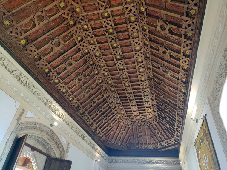 Si subes por las escaleras que proceden de las mazmorras debes prestar atención a la techumbre. Es uno de los ornamentos que más me gustaron de todo el conjunto, además del patio de armas. Se trata de alfarjes, es decir, techos con madera labrada y entrelazada artísticamente.